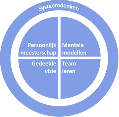 Centraal staat de ‘5e discipline’ systeemdenken: het vermogen om krachten en verbanden te zien tussen de verschillende niveaus of systemen binnen en buiten de organisatie. Systeemdenken laat de verbanden zien tussen de oriëntaties op personen, teams, organisatie en ecosysteem. Denk bijvoorbeeld aan: vergroten van kennis en vaardigheden, vormen van een intern beeld van de omgeving, hebben en realiseren van een visie, en het vergroten van het lerend vermogen.